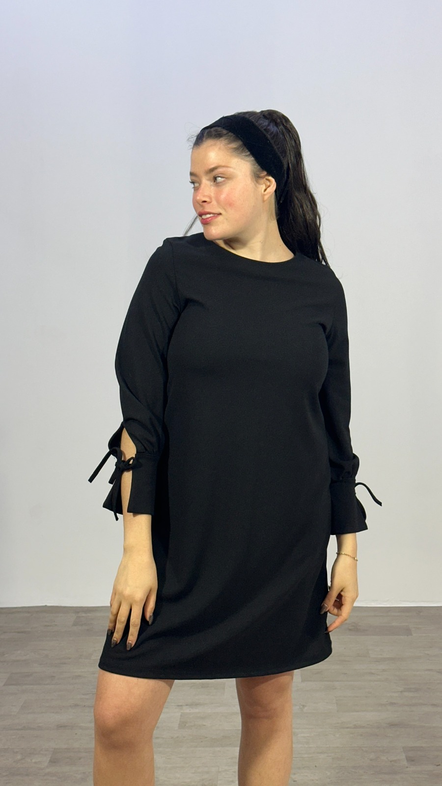 שמלה מבד יציב בגזרה A, צווארון מעוגל, שרוול 3/4 עם פטנט רחב וחוט לקשירה