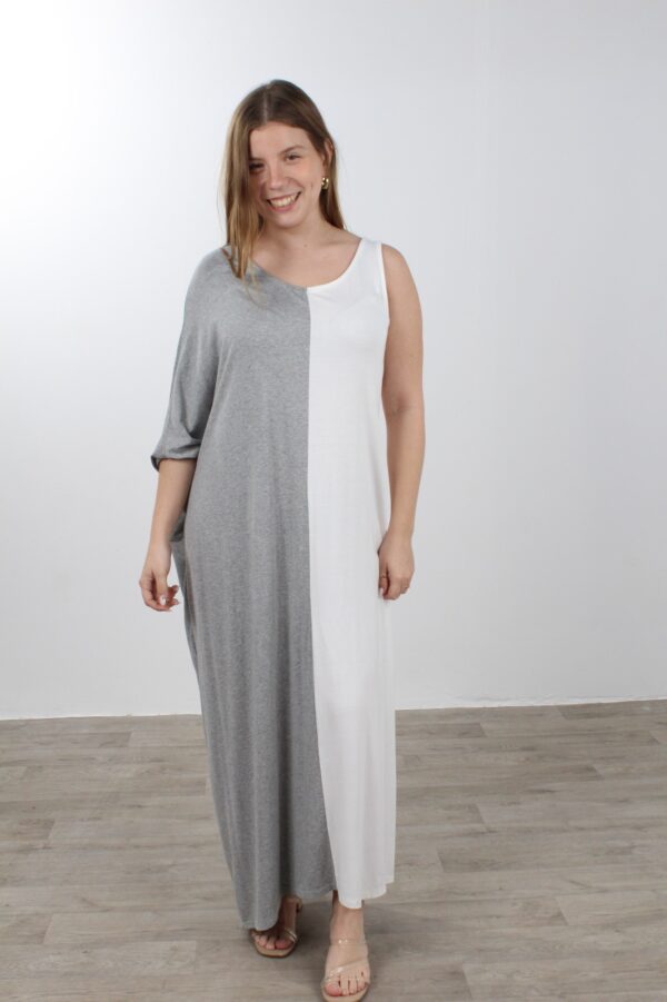 שמלת בד משולבת 2 צבעים שרוול גופיה ושרוול עטלף עם צווארון עגול