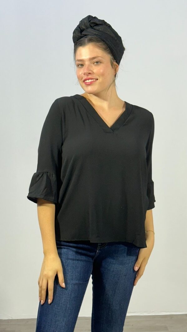 חולצה בגזרה רחבה עם צווארון וי ושרוולי 3/4