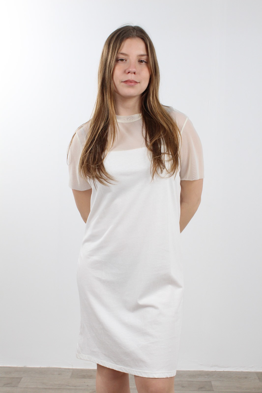 שמלה בגזרה ישנה מבד כפול, רשת בחלק העליון וצווארון עגול סגור