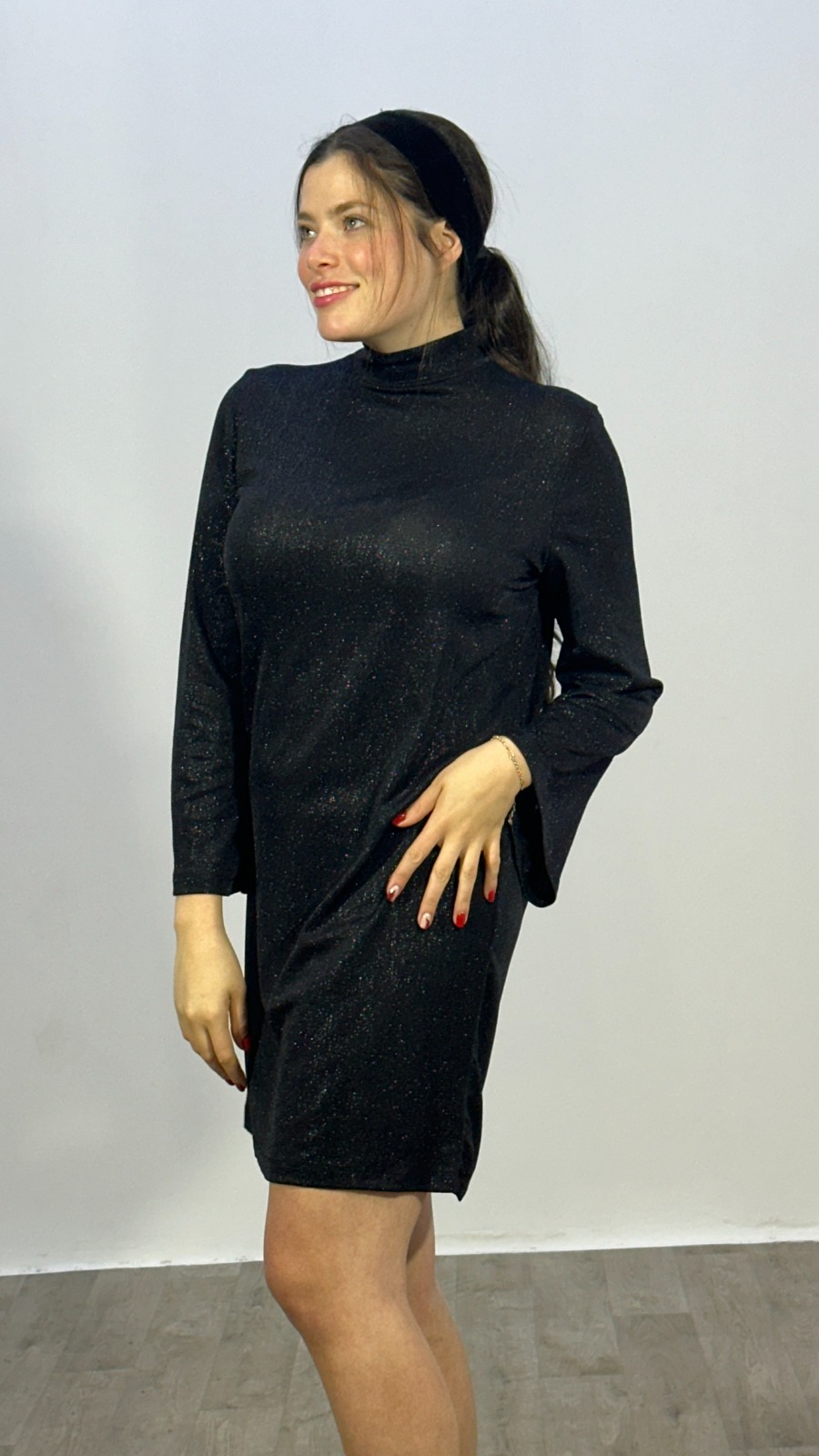 שמלת לורקס עם צווארון גבוה ושרוולים מתרחבים.