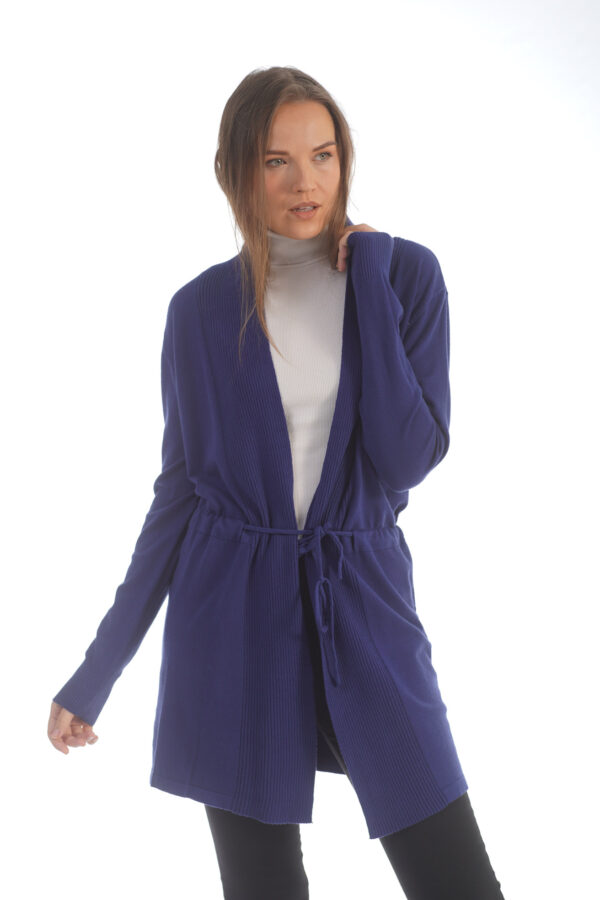 סריג קרדיגן מדהים מבד רך ואיכותי עם חגורת שרוך נקשרת במותן.
