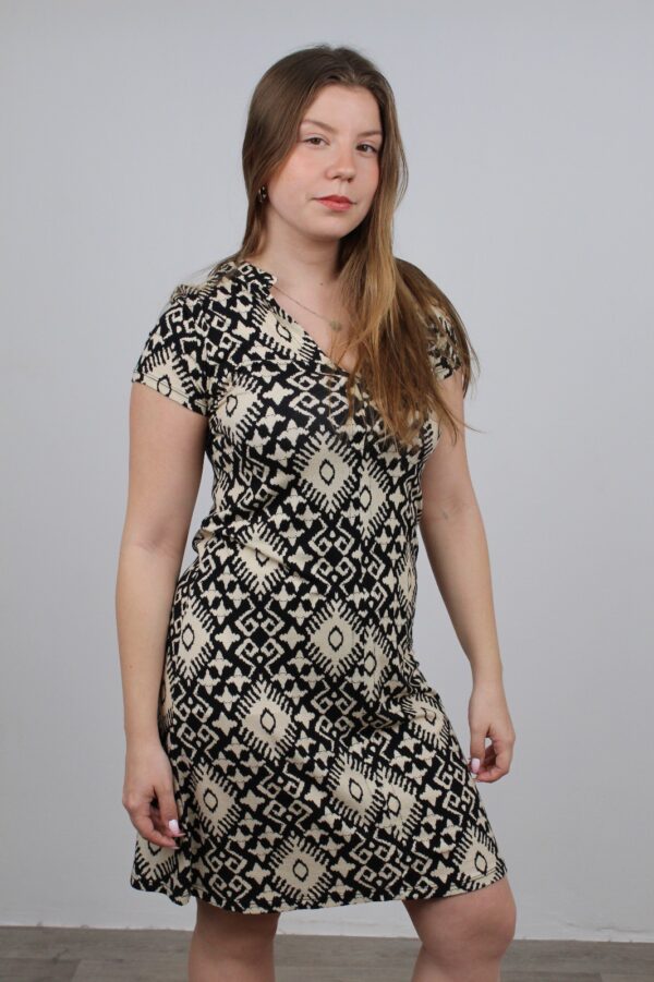 שמלה בגזרה ישנה עם צווארון וי בשילוב דפוס