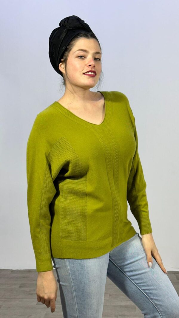 חולצת סריג בגזרת עטלף עם צווארון וי משולבת טקסטורת