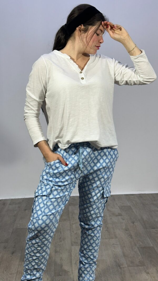 מכנס דגמ”ח מבד מודפס במראה מקומט, עם כיסים וחגורה, מתאים לכל עונות השנה