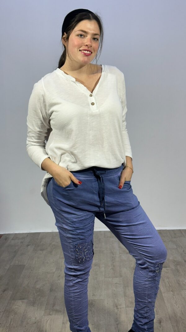 מכנס במראה מקומט, עם גומי וחוט קשירה ובתוספת פאצ’ים של פאייטים ברגליים, מתאים לכל עונות השנה
