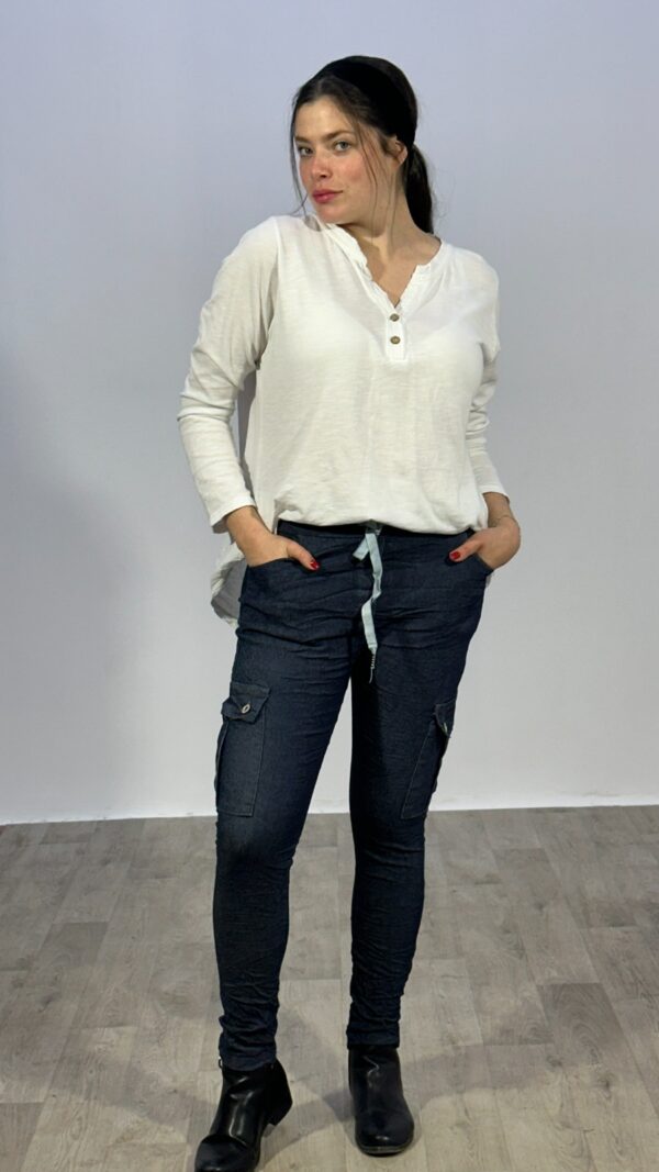 מכנס מבד דמוי ג’ינס במראה מקומט, עם גומי וחוט קשירה, מתאים לכל עונות השנה