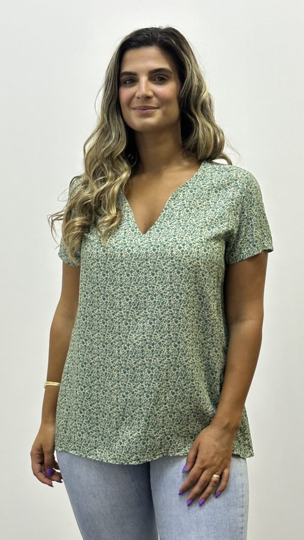 חולצה בגזרה ישרה עם צווארון וי משולבת דפוס