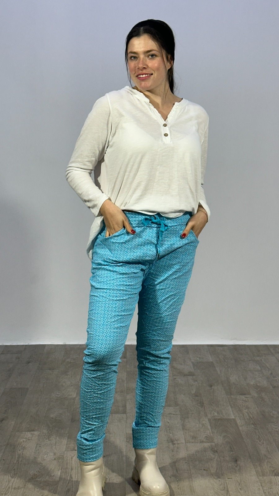מכנס לייקרה מודפס עם כיסים ושרוך בשטיפת ווש למראה לא אחיד בצבע