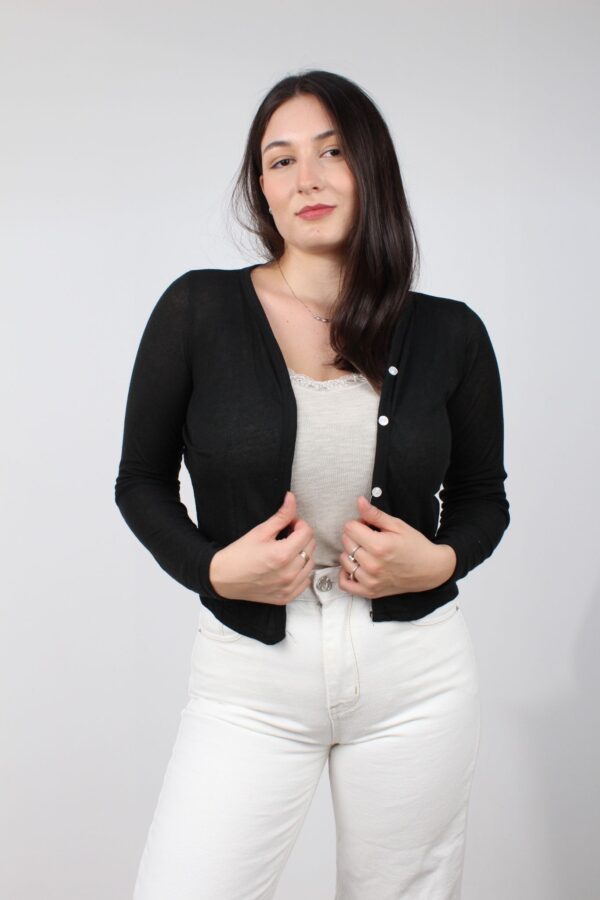 קרדיגן קצר בגזרה צמודה וקצרה בשילוב כפתורים לסגירה
