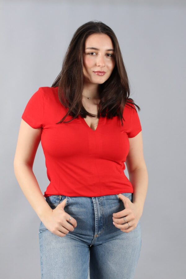חולצה בגזרה ישרה עם צווארון וי ותיפורים בחלק הקדמי של החולצה