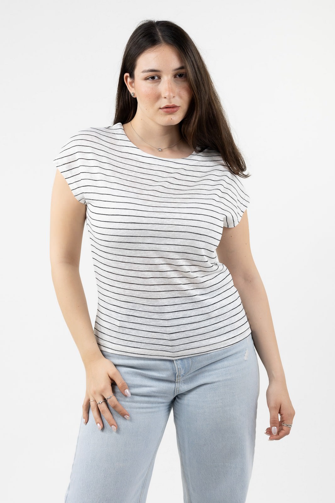 חולצת פשתן פסים דקים בגזרה צמודה עם צווארון עגול