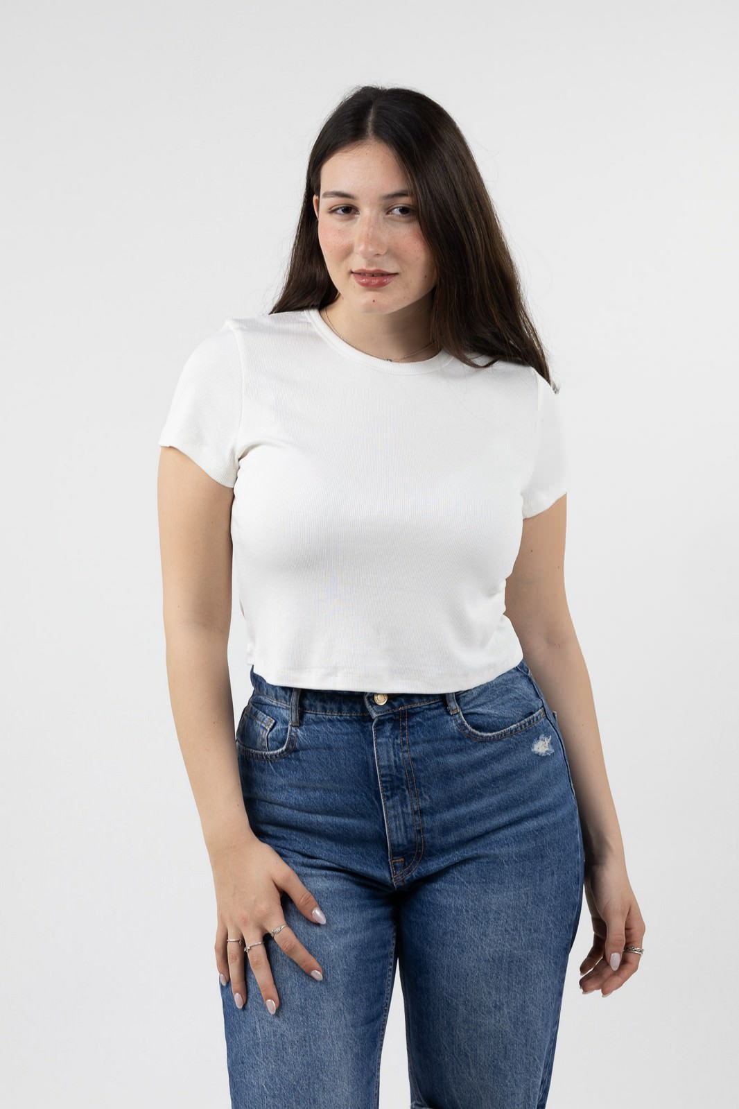 חולצת בייסיק קרופ בגזרה משוחררת עם צווארון עגול מבד ריב ויסקוזה